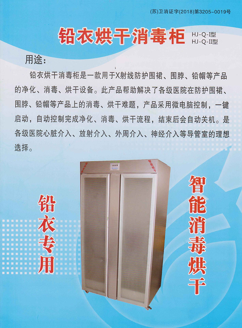 鉛衣烘干消毒柜是-款用于X射線防護(hù)圍裙、圍脖、鉛帽等產(chǎn)品的凈化、消毒、烘干設(shè)備。此產(chǎn)品幫助解決了各級(jí)醫(yī)院在防護(hù)圍裙、圍脖、鉛帽等產(chǎn)品上的消毒、烘干難題,產(chǎn)品采用微電腦控制,一鍵啟動(dòng),自動(dòng)控制完成凈化、消毒、烘干流程,結(jié)束后會(huì)自動(dòng)關(guān)機(jī)。是各級(jí)醫(yī)院心臟介入、放射介入、外周介入、神經(jīng)介入等導(dǎo)管室的理想選擇。